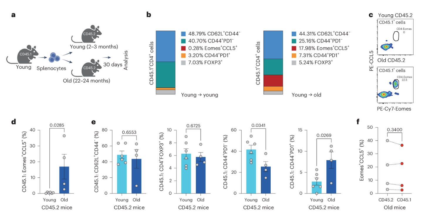 젊은 쥐의 면역세포를 늙은 쥐에게 이식하자, 노화 환경이 이 세포들을 ‘청소부대(CD4-Eomes, 빨간색)’로 변신시켰다.