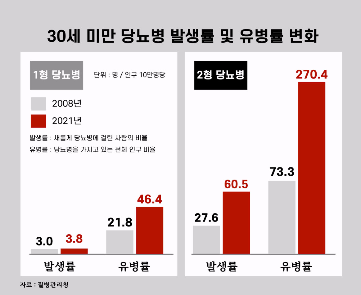 질병관리청 국립보건연구원이 2025년 8월 발표한 연구 결과는 충격적이다. 30세 미만 2형 당뇨병 유병률이 2008년 인구 10만 명당 73.3명에서 2021년 270.4명으로 13년 만에 4배 가까이 증가했다. 청소년기(13~18세)에서 증가세가 가장 두드러졌다.