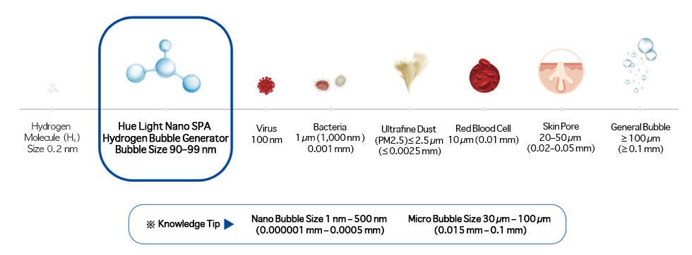 침투력’과 ‘지속성’이 다릅니다. 마이크로버블(50µm)은 모공 입구만 세정하고 금방 터져버리지만, HM-SPA500의 나노버블(100nm)은 세포 간극보다 작아 진피층까지 침투하며, 물속에서 터지지 않고 장시간 수소 에너지를 전달합니다. (KAERI 검증 완료)