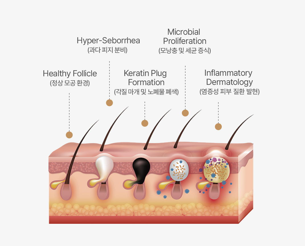 일반적인 물 분자나 마이크로 버블은 표면장력으로 인해 모공 깊숙이 침투하기 어렵습니다. 반면, 90~99nm의 나노버블은 브라운 운동(Brownian Motion)을 하며 물속에 장시간 체류하고, 모낭 및 한선 깊은 곳까지 침투하여 노폐물을 물리적으로 밀어냅니다.