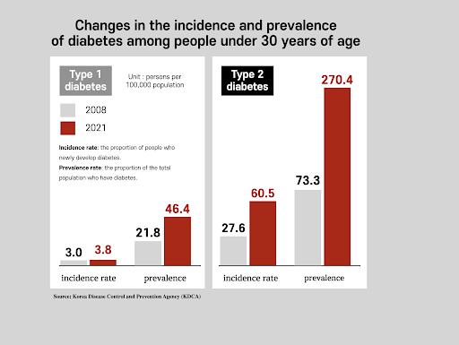 The research results released in August 2025 by the KDCA National Institute of Health are shocking. The prevalence of type-2 diabetes among people under 30 rose from 73.3 per 100,000 in 2008 to 270.4 per 100,000 in 2021, nearly a fourfold increase in just 13 years. The increase was most pronounced among adolescents aged 13 to 18.